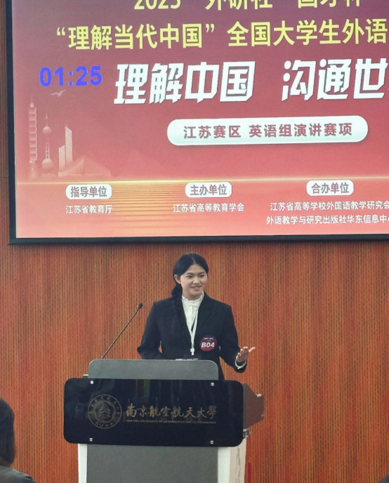 比赛分为3分钟定题演讲和1分钟即兴问答,赛场氛围紧张热烈,两位选手沉着冷静,展现出扎实的外语功底、卓越的语言表达能力与临场应变能力。选手们在赛前做了充分准备,围绕演讲赛题,深入了解“击水中流,破浪前行”的内涵与其对当代中国及当今世界的影响,生动诠释青年一代传承奋斗精神、勇立时代潮头的历史接续。同时,在指导老师的悉心指导下,参赛选手们反复打磨演讲稿并进行模拟练习,确保在比赛时做到流利表达不怯场。此外,南京航空航天大学作为主办方,为大赛提供了完善的竞赛场地、良好的赛事组织协调等全方位的支持,确保比赛顺利进行。此次比赛不仅为参赛选手提供了一个展示自我的平台,也为推动高校英语教育、提升学生综合素质起到了积极作用。
