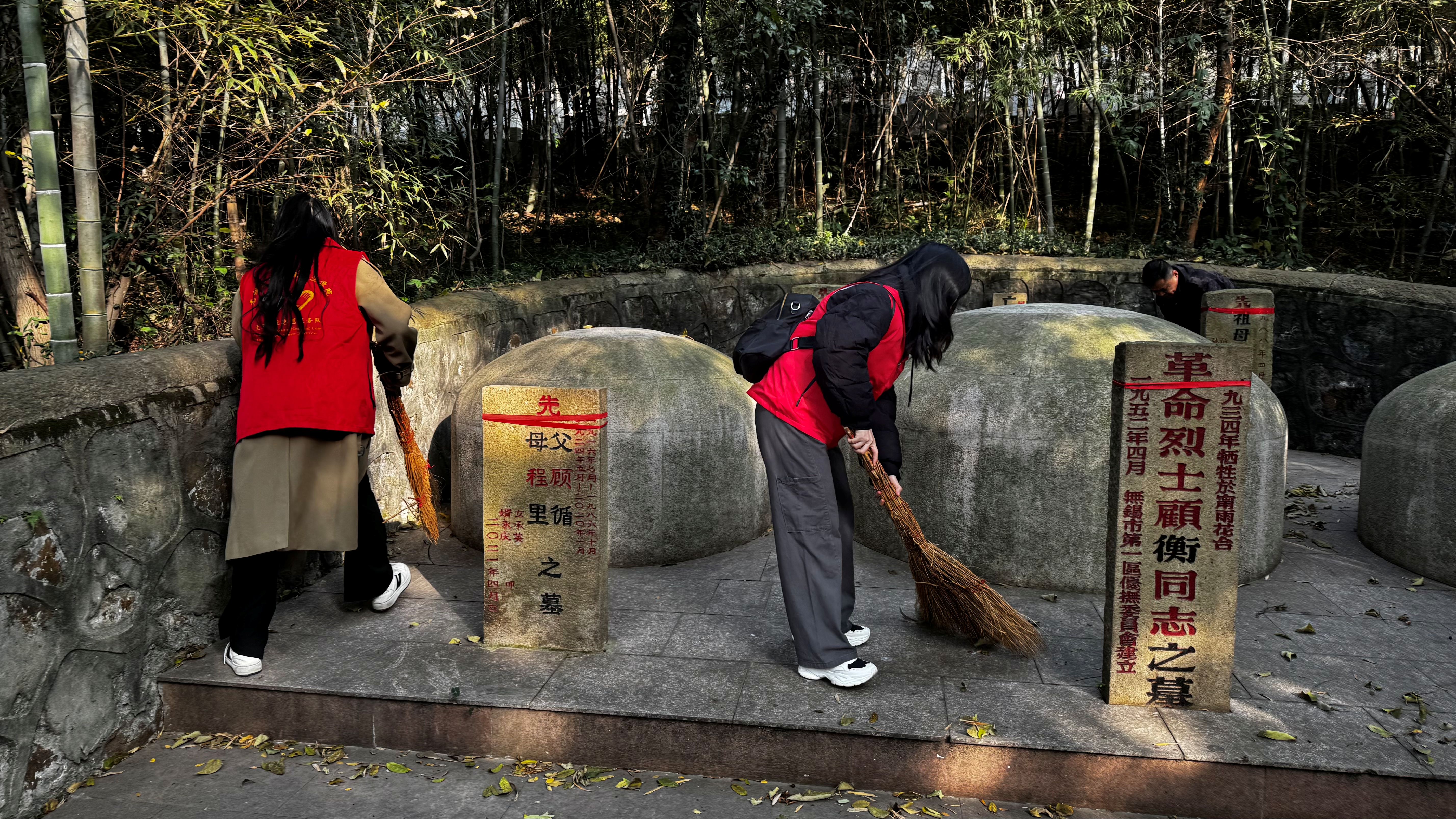 接着,祭扫仪式庄严举行。主持人致悼辞,深切回顾了顾衡同志为民族独立、人民解放和国家富强抛头颅、洒热血的丰功伟绩,并号召全体人员继承先烈遗志,汲取奋进力量,投身于新时代的建设征程。悼辞毕,全场肃静。“向革命烈士默哀!”主持人话音落下,全体人员垂首默哀一分钟。深深的哀思弥漫在陵园上空,时间仿佛在此刻凝固,唯有清风诉说着不尽的怀念。默哀结束后,大家深沉凝重地面向烈士墓碑,怀着无限的敬仰,深深鞠躬。最后,全体同学依次上前,向烈士墓敬献手中素雅的菊花。朵朵菊花,寄托着对人民英雄的深切缅怀与崇高敬意,也象征着先烈精神永垂不朽,万古流芳。