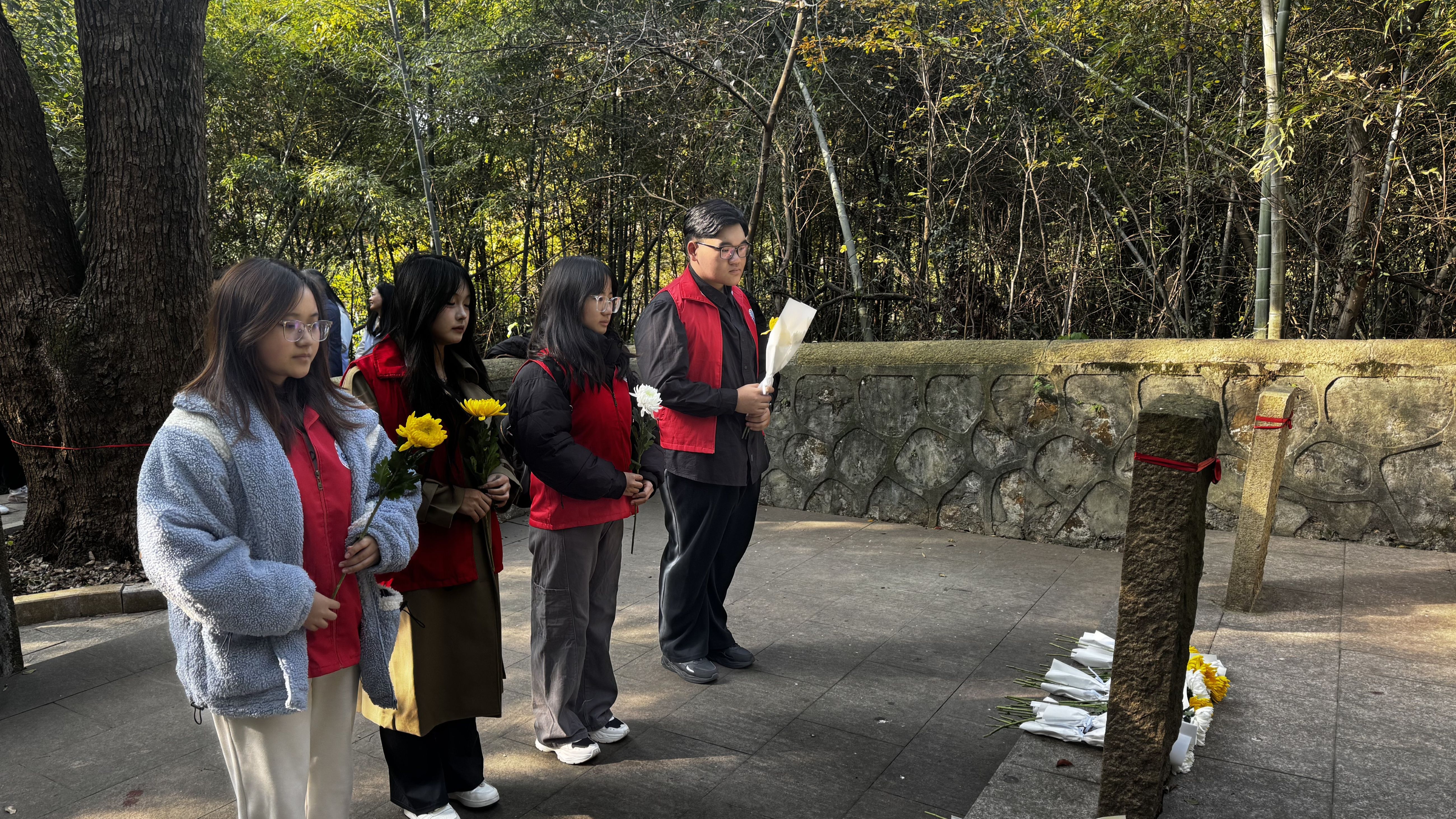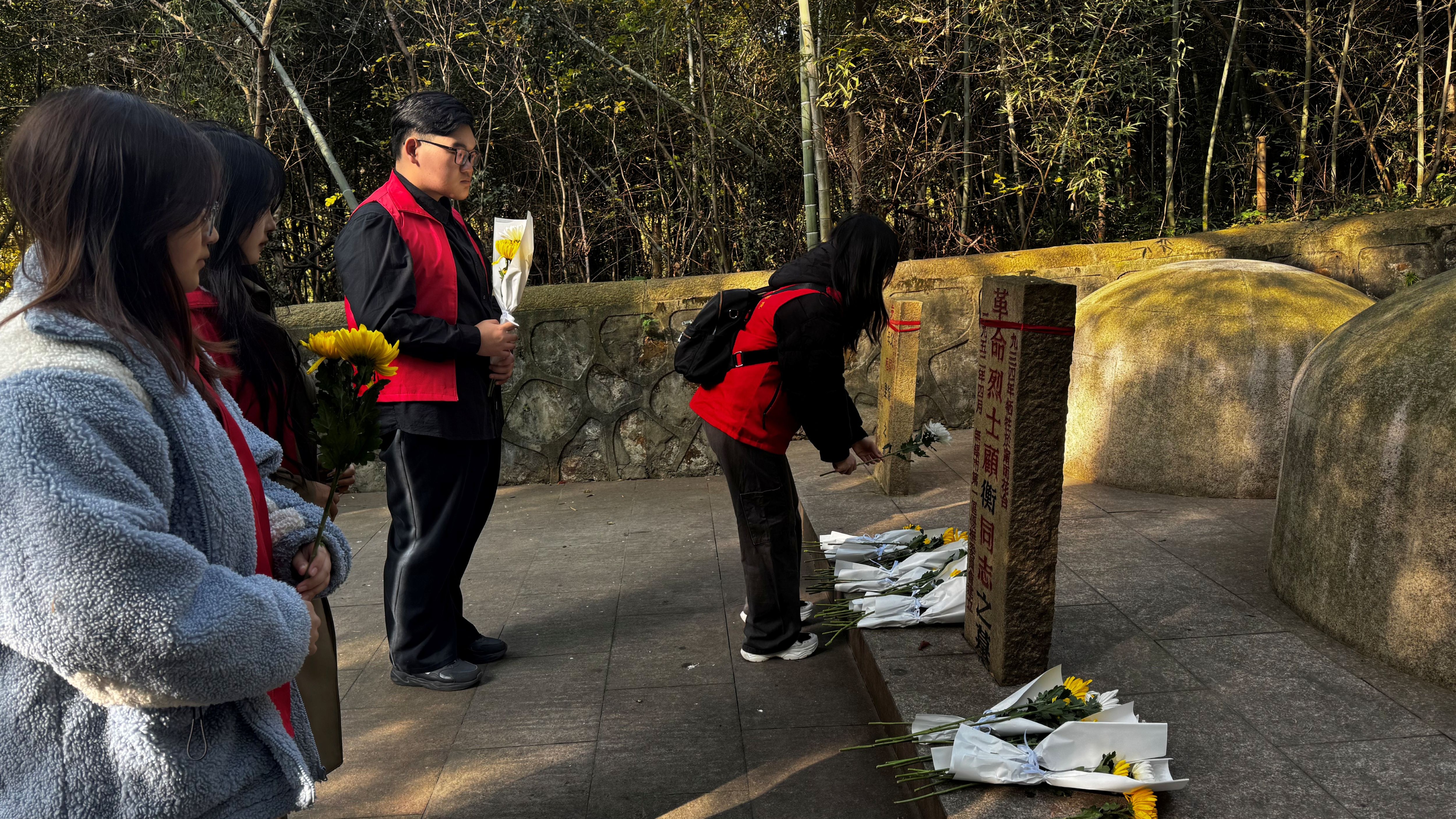 为引导学生铭记历史,缅怀死难同胞与革命先烈,深刻认识侵略战争的深重危害,树立“勿忘国耻、珍爱和平”的坚定信念。传承红色基因,厚植家国情怀,激发青年学生的爱国热情与责任担当,增强民族自豪感与历史使命感。无锡太湖学院文法学院学工助理团于12月12日上午在无锡市新峰社区居民委员会以及相关单位的带领下,前往位于梅园公墓的顾衡烈士墓开展“缅怀先烈志,薪火永相传”国家公祭日主题活动。